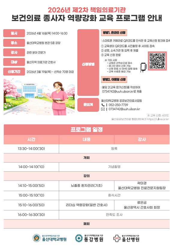 교육·행사연계 FACEBOOK 공유하기 KAKAO TALK 공유하기 KAKAO STORY 공유하기 메인으로 이동 교육·행사연계 우리네 소개 주요사업 자원연계 교육·행사연계 커뮤니티 마이페이지 개인정보처리방침 교육·행사 신청 교육·행사 신청 교육 · 행사 신청조회 교육·행사연계 교육·행사연계 교육·행사 신청 교육 · 행사 신청조회 교육·행사 신청 교육 · 행사 정보 교육·행사명 종료 2026년 제2차 책임의료기관 보건의료 종사자 역량강화 교육 프로그램 교육·행사 일시 2026-04-16 14:00 ~ 2026-04-16 16:30 신청기간 2026-03-19 00:00 ~ 2026-04-15 00:00 교육·행사 장소 울산대학교병원 본관 5층 강당 모집인원 73명 담당자 정가연 문의 052-250-7739 상세내용 첨부 붙임 2. 교육 참가신청서.hwp (96KB) 목록
